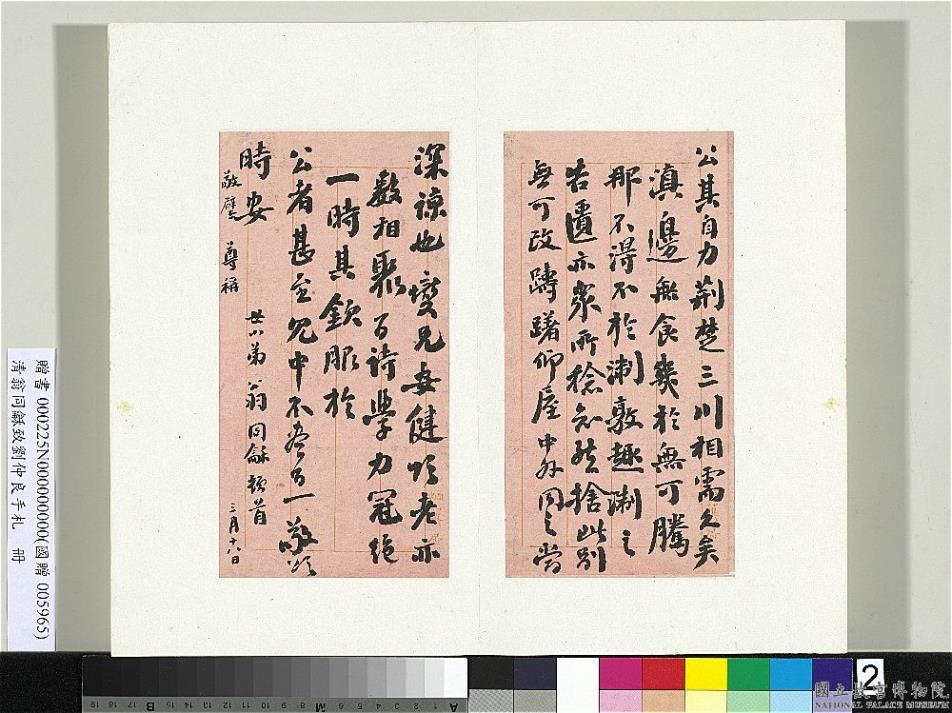 仲良吾兄世大人合下。夏初通一函。嗣此尘事纷杂。遂疎音敬。有时西笑。意常在峨眉汶岭间也。即日伏惟起居万福。同龢在鹓行中。正如雁鹜。趋走沓拕。不鸣不舞。岁华荏苒。徒愧屠苏耳。闽中族人道鸿随任在蜀。于彼中山川熟习久矣。曩在滇在台。屡着劳绩。今又隶公仁宇。伏望推屋乌之爱。试以艰巨摩厉而玉成之。感同身受。专此布恳。敬颂勋安。并贺年喜。不次。世愚弟翁同龢顿首顿首。除夕。