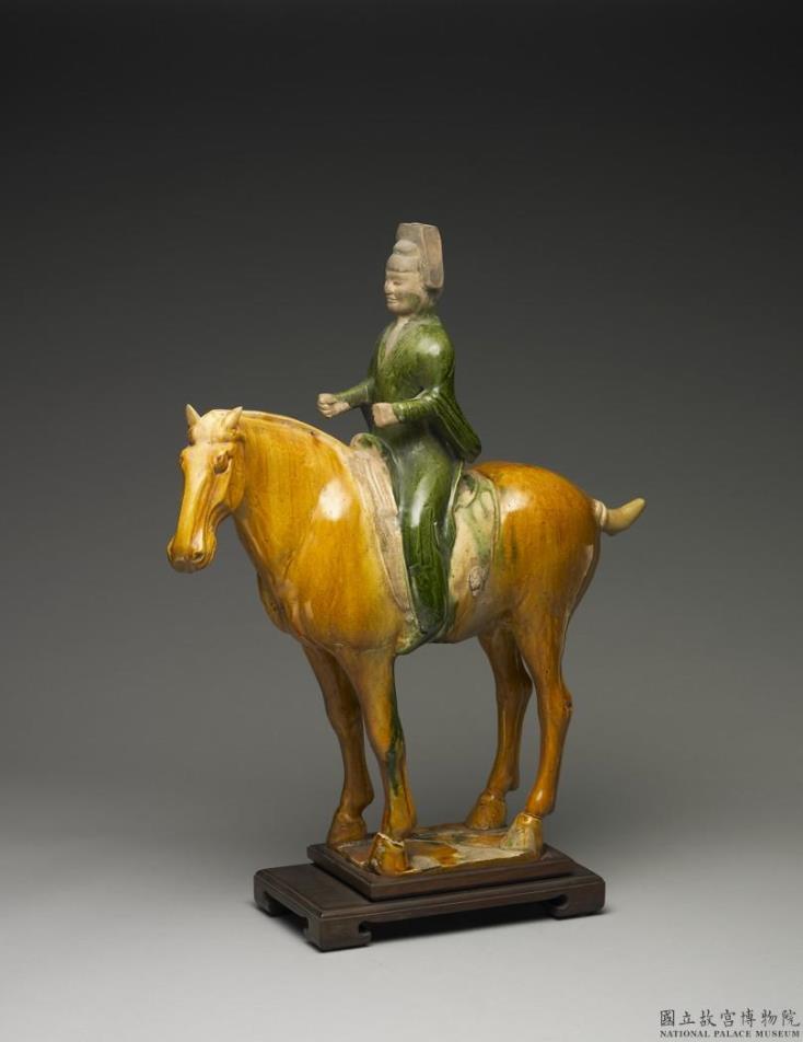 这一件唐代的三彩骑马俑的骑士头带幞头,身着长袍,腰系宽带,足穿靴。其双臂曲于腰部两侧,双手呈握缰状,脚踩马蹬,威风凛凛,跨坐骏马鞍鞬之上。马匹凝神竖耳,鬃毛分披前额二侧,马首微向左望。马身骨肉亭匀,体态雄健,短尾细结,长身立于薄板之上。马匹及人物皆以灰黄色陶土为胎,先上白色化妆土,再施低温铅釉,马匹以褐色,人物则以绿色为主,褐、绿、黄、白交接,釉色饱满鲜亮。骑士的脸部及双手原应有彩料描绘颜色,可惜现已不存。 唐代时,贵族高官习以大批对象陪葬,当时「竞为厚葬,偶人象马,雕饰如生,徒以炫耀路人」,可见在厚葬之风盛行的情况下,大量装饰华美的象生作品也应运而生。盛唐时的三彩陶俑,正反映了贵族高官们生前显赫的政、经地位,也寄托了墓主人想将生前权势财富重现于死后世界的意图。