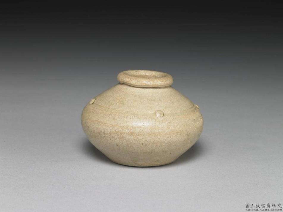 青瓷,小口,斜肩,硕腹,平底,深壁,口缘外卷,肩部有ㄧ凹入之弦纹一道,弦纹上有四乳丁,平均分置于弦纹上,其余部分光素无纹,可见细密开片。