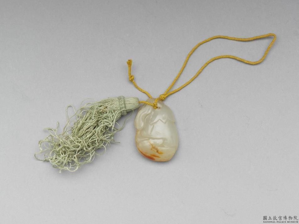 玉质,雕作茄形,浅雕叶片,茄果底部留赭色玉皮,顶部带穿,系绳及丝穗以作佩饰。