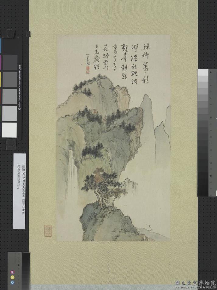 踈柳萧萧影。澄潭秋欲波。数峰斜照里。古寺在烟萝。乙未(公元一九五五年)岁朝。心畬。