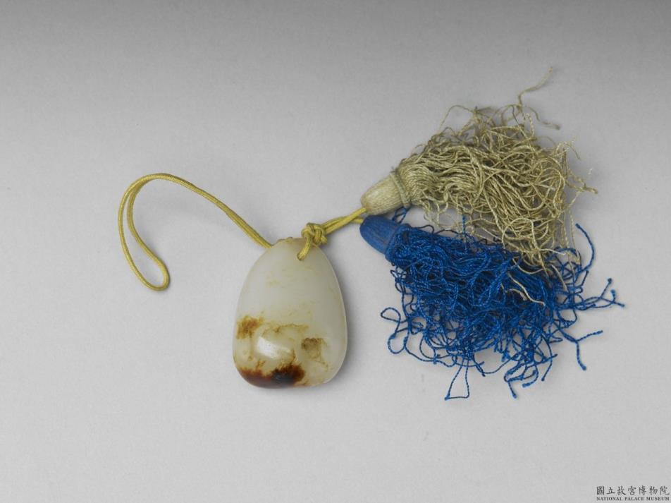 卵石形青白籽玉,带块状深褐色玉皮及玉璺,质地温润。打一穿,系绳与丝穗以作佩饰。