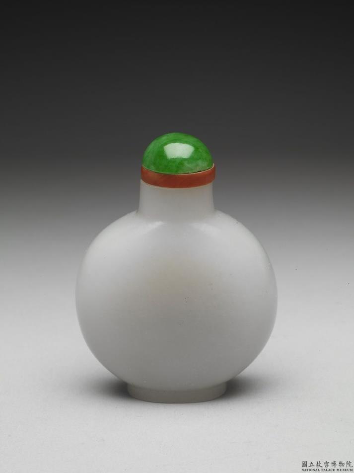 硬木盒中有锦座,用来存放造型不同的四件玉鼻烟壶,分别是:翠玉瓶式鼻烟壶,带粉红碧玺盖与牙匙。翠玉瓶式鼻烟壶,带玉托尖晶石盖与牙匙。玉扁圆壶式鼻烟壶,带珊瑚托翠玉盖与牙匙。玉方瓶式鼻烟壶,带珊瑚托蓝宝石盖与牙匙。又有玉烟碟一。