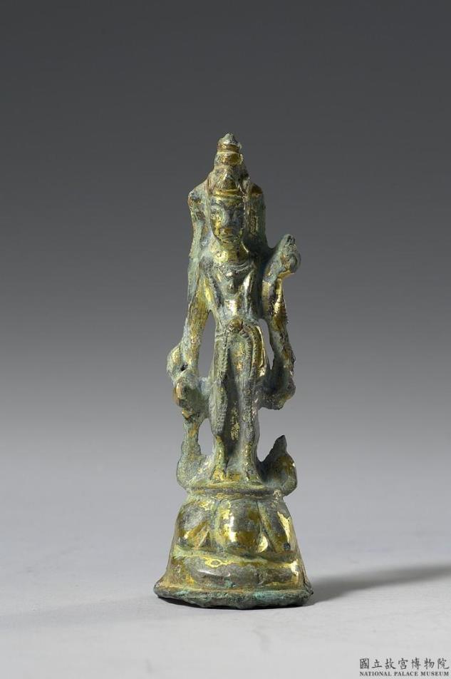 此像头戴三叶冠,冠带垂落,肩披天衣,颈挂项圈,璎珞相系于腹前,左手上扬,右手下垂,皆有持物。然而,由于破损严重,且表面生铜绿,因此持物不明。此像左脚在前,右脚在后,腹、臀随此一站姿而扭向其左,使其姿态颇具动感,乃唐代菩萨造像的特色。然而,头部较大,上、下身比例接近为一比一,又颇似隋代风格,故推测此像为唐代初年的作品。