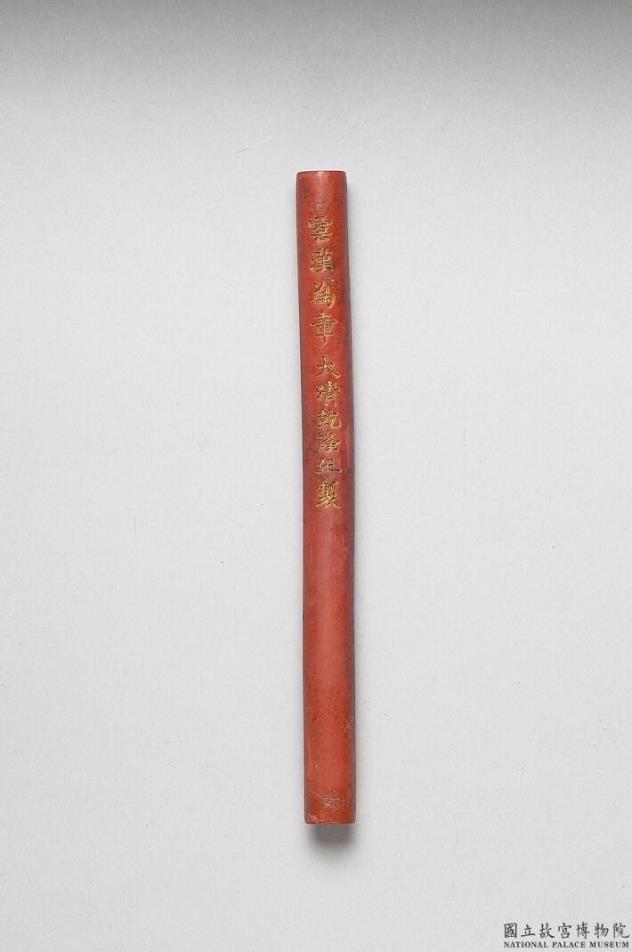 长条圆柱朱墨。上模印有填金楷字「御用」、「淳化轩摹古墨宝」、「云汉为章」、「大清乾隆年制」等铭记款识。此墨与其他十墨同储一屉。