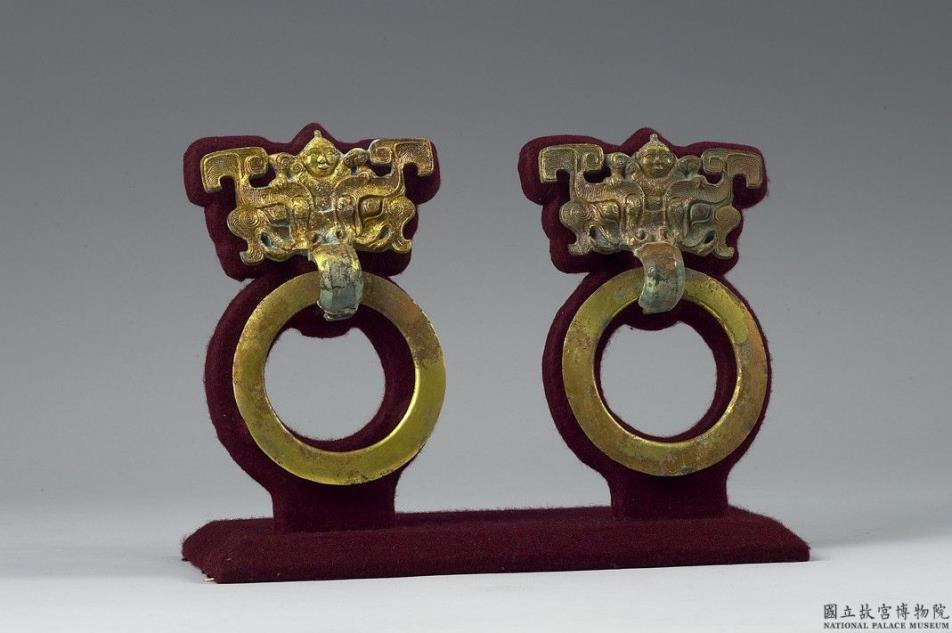 人形兽面纹鎏金铜铺首一对,鎏金略有剥落。许多铜器上及漆木器上的双耳常作成兽首衔环的铺首造型,到后来尺寸加大,并且成为建筑上常见的装饰,一些豪门巨宅的门扉上似乎部少不了一对大大的铺首门环。许多汉墓中也有出土,有些则是棺椁上的装饰品。如一九八三年广州出土的南越王墓中,主棺的外椁上就有着六枚大铺首。这一对鎏金铺首大兽面的额间蹲踞着一个奇特的人形,头上梳着椎髻,面形饱满,唇角略扬,似微微含笑,四肢却如鸟爪,踩踏在大兽面的双角及兽唇之上。如此的人面鸟身以及与兽首的组合十分罕见,未知是否与汉代追求羽化升仙的思想有关。