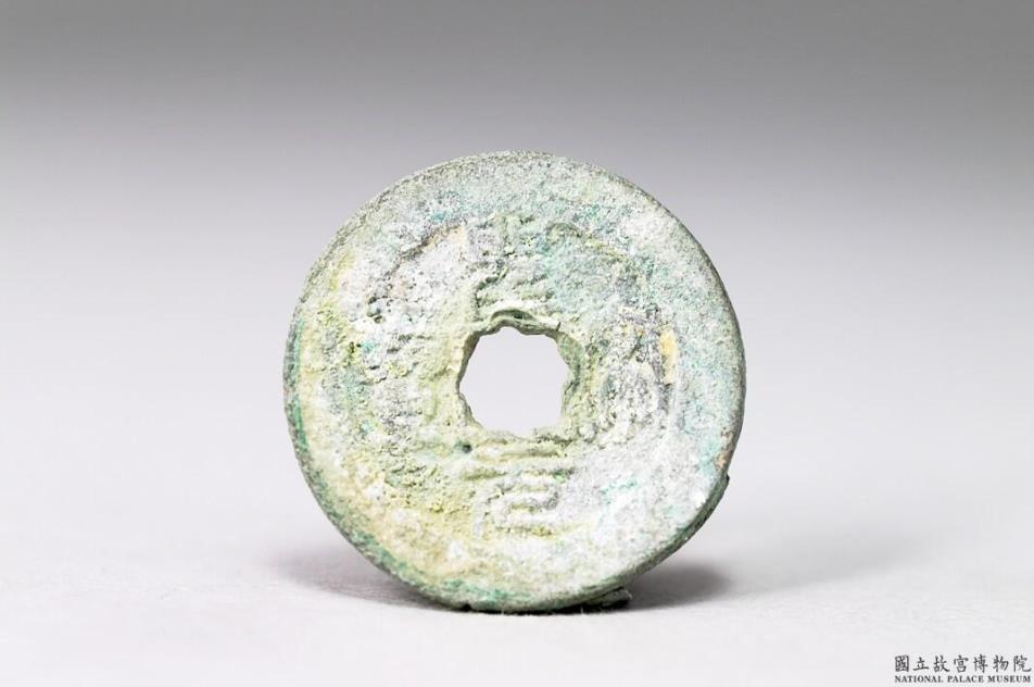 方孔圆钱。「圣宋元宝」,为国号钱,有篆、隶、楷、行四种字体,又有铜、铁两种材质。此枚铜钱正面有篆书「圣宋元宝」四字,背面无文。