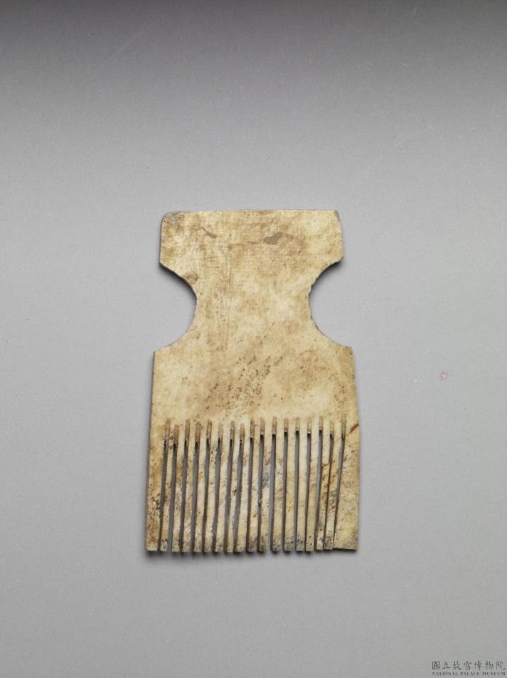 器由一块牙材磋磨而成,柄部中段内凹,利于执拿:十六根梳齿,两端乃梳背之延伸。全器磋磨工艺朴拙。商代晚期开始,梳篦虽然仍多作长方形,但梳柄已开始变化,出现不规整的方形,在山西宝鸡筑围沟西周墓中即曾出土梳柄中腰凹缩的长方型梳篦。