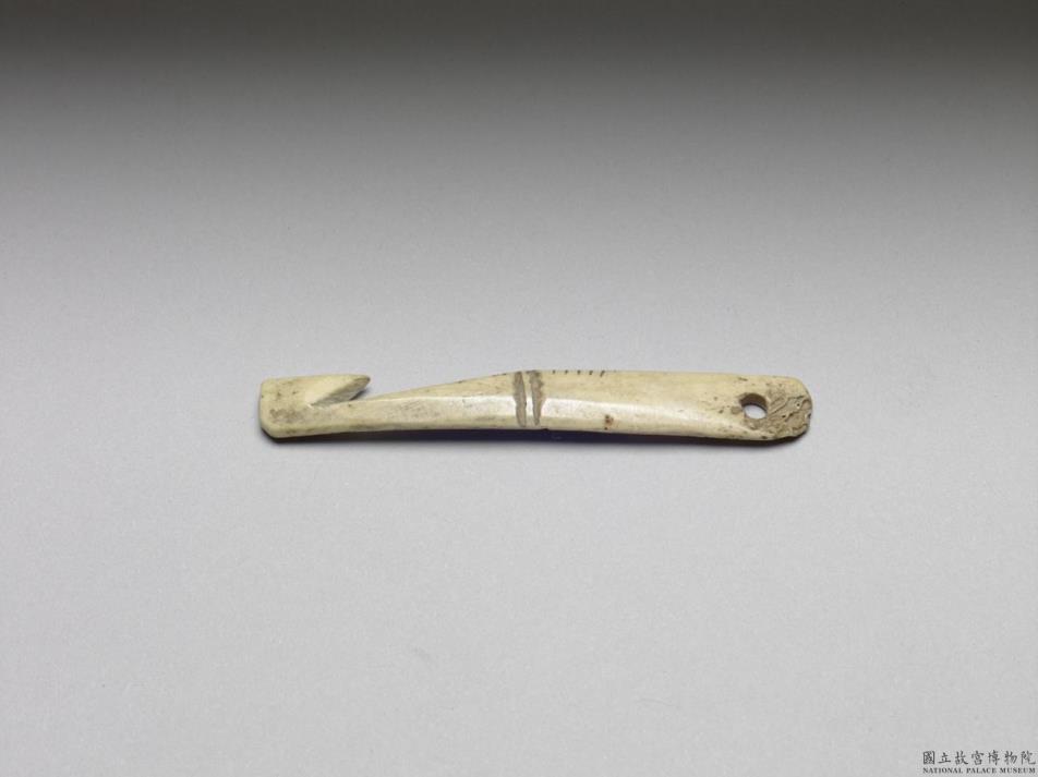 细长条形,略弯弧,一端刻出弯勾,一端钻一孔,器中端两面皆各刻二道弦纹为饰,器表打磨光滑,有孔之一端有蚀痕。此器刻工古朴,一端有一孔可穿系,另一端琢出一钩首以供勾系,应为一实用器。