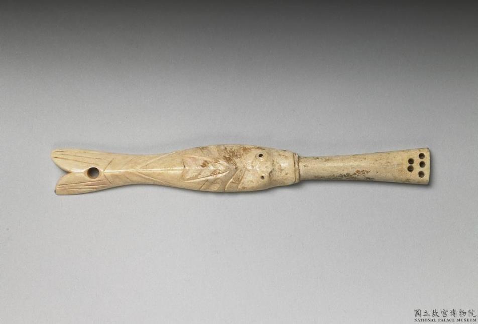 器作俯视鱼形,唇、眼、脊等部位突起,自鱼唇部位伸出一长柄,柄端穿凿五个小孔,排列为两行,器背此部位另刻凿四道凹槽,略呈梳齿形;圈点纹为鱼眼,两睛凹凿小孔,尾部穿凿一孔,可供点缀。此器背面磨平,鱼身部位仍留下骨管中空之凹槽,或为嵌件。