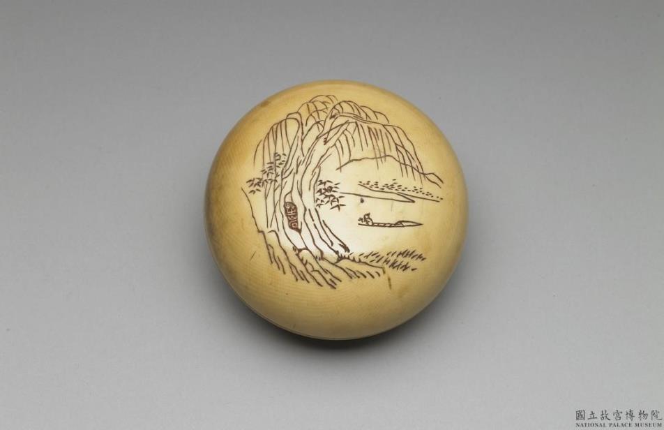 扁圆形盒,矮圈足,以子母口扣合,盖与器身分别各以一块牙材制成,口缘各以一道弦纹为饰。盖面线刻柳溪与孤舟,柳树干上减地浮雕「芝岩」二字款,其四周减地填红料似一字号印;器身圈足内正中部位减地浮雕方印一:「平斋珍藏」,印文四周填红料。盖面印文之红料色泽较足内者深。「芝岩」或以为清前期嘉定著名竹人周颢的号之一。「平斋」乃清末吴云之号。