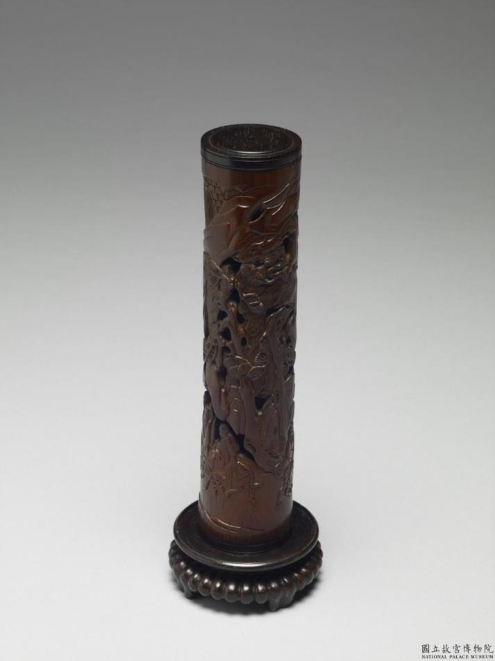 取一段竹材,近口缘处雕一关口,关门敞开,半掩于山石后;关门前有二人,一长髯老者骑牛前行,一戴笠蓄须文士骑马后随;隔着山石有一行六人,四骑骡驴文士前行,另有一骑骡驴文士后随,旁侍一肩挑花篮小童,此行五文士中有四人头戴平顶巾帻;山石人物间浮雕松树,其间处处镂空,以供出烟。器身上下缘各嵌一片紫檀木为盖与底,木盖中央凿一孔,以示出烟。「七贤过关」题材曾一再出现于明代绘画或器物上,当时人多以为是唐人,但是郎瑛在《七修类稿》书中已指出:「盖春秋有七人,唐有七爱,宋有七老,建安有七子,未尝称贤也,惟晋有竹林诸人称贤耳!又考王戎尝乘小马(骡也),山涛乘驴,刘伶乘鹿车,余则乘马,正符七人之数,跨鹿车后或讹画为牛也。」嘉靖时的陆深也在《余台纪关》中说:「观其画衣冠骑从,当是魏晋间人物,意态若将避地者。」