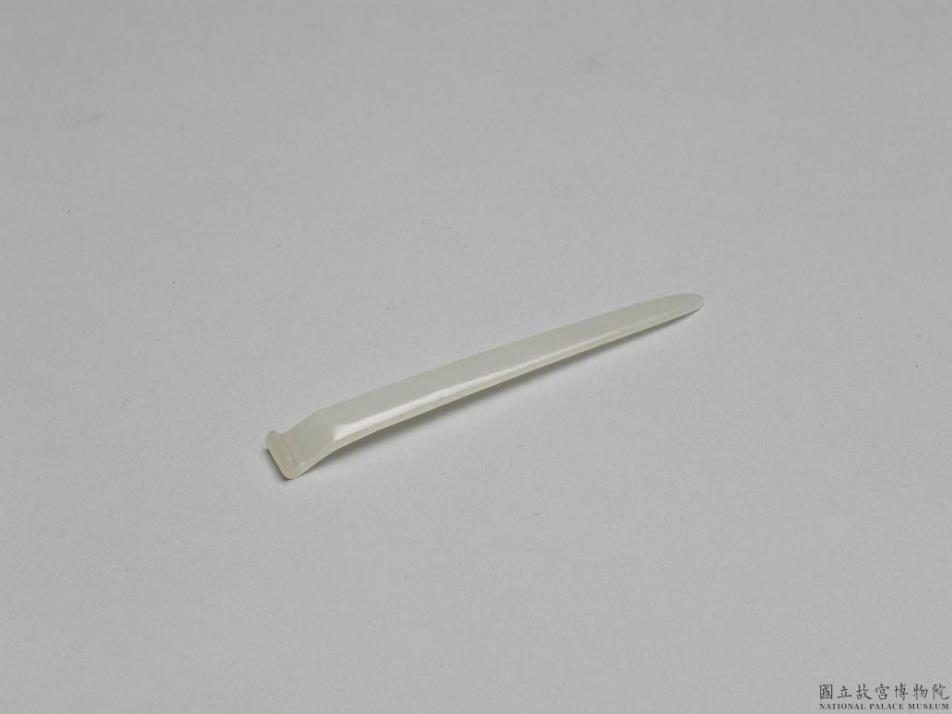 宽扁簪,以白玉雕成,上宽下窄,器身微呈弧形,簪首微外折,顶端下卷似钩,全簪素面无纹,质地白净,器面光泽莹润。
