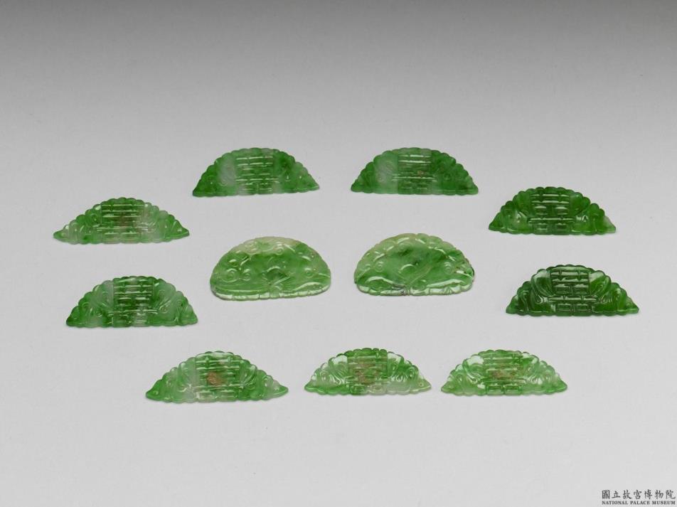 片状绿玉饰件十一件,外型略成半圆,色绿而间杂白斑。其中九件外壁中央雕一「囍」字,两侧雕衬飞舞翻折的绶带;另外两件雕饰弧线与小涡卷,既如伸展的叶片,又似振翅的蛾蝶。这些玉饰件,应该是清宫制作器物时的配件。