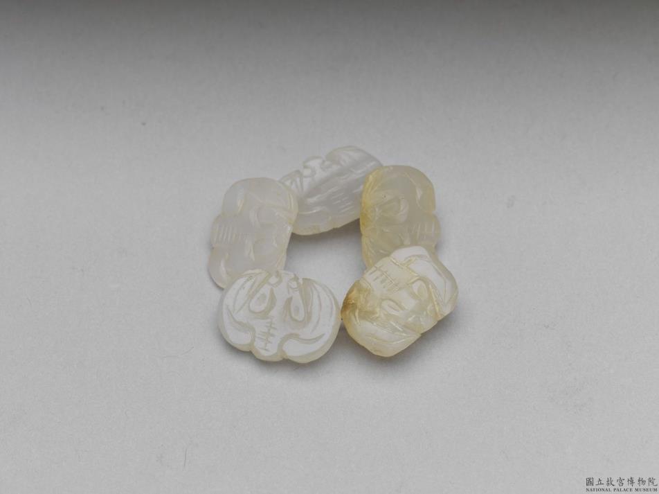 白玉质钮五粒,玉色莹润,有半透明之感,部分带些许黄斑。钮身为片状,轮廓作蝙蝠形,外侧打磨成圆弧而略薄;正面简单雕出蝙蝠各部位,刻工朴拙;背面光素无纹,唯中央带一钮穿以供线绳穿系。采用蝙蝠为饰,有「福」之吉祥寓意。