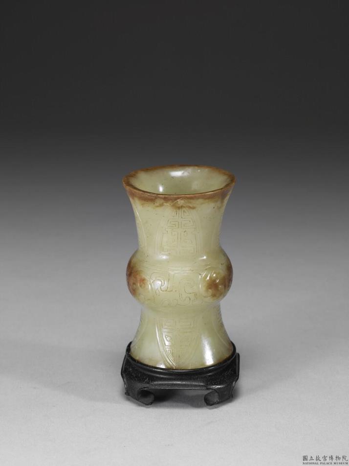 青白色玉,夹带数处褐斑。全器仿青铜器雕琢成一「觚」之造型。此器微撇口,长颈,鼓腹,高撇圈足。颈部与圈足阴刻蕉叶纹,腹饰兽面纹。带木座,有标签「重二百卅号」。