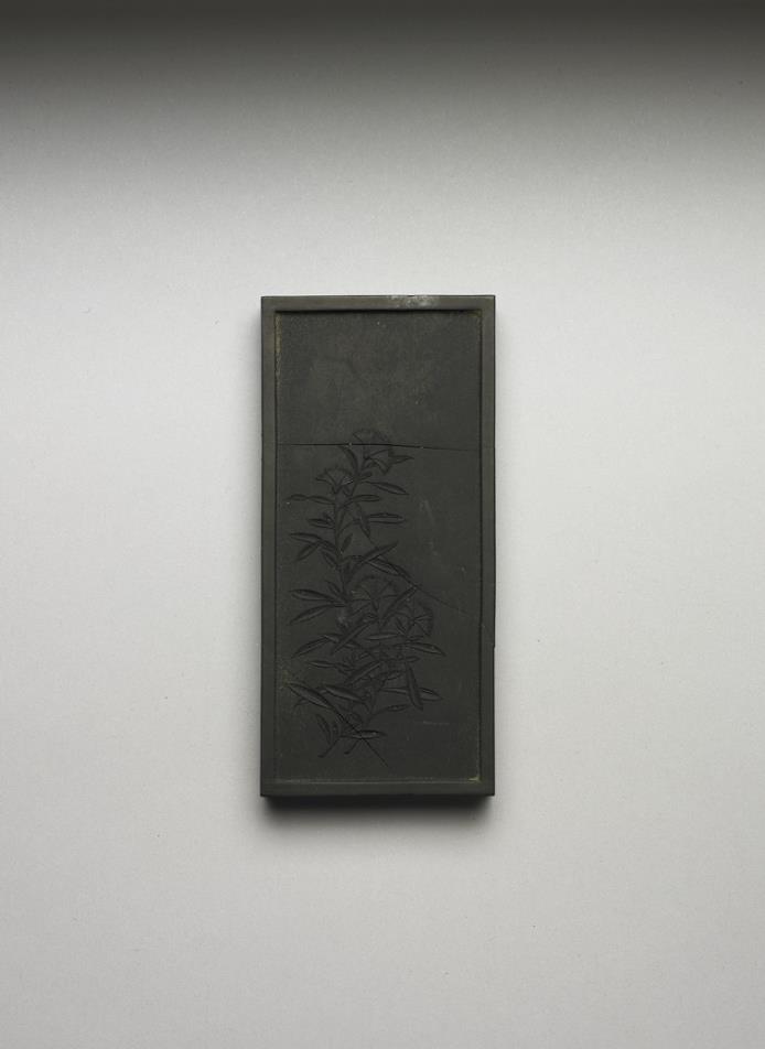 长方形墨,边框起棱。一面有填金隶书乾隆诗作:「御咏石竹。石侧㛹娟致冶幽,有枝有叶却非修,不于霜后看棱节,五色应迷王子猷。」一面模印石竹两枝由右下伸出,花叶繁茂,作盛开之状。墨侧有「大清乾隆年制」楷款。是墨与其他四十七块同储一盒,为成套之乾隆御制花卉诗套墨。