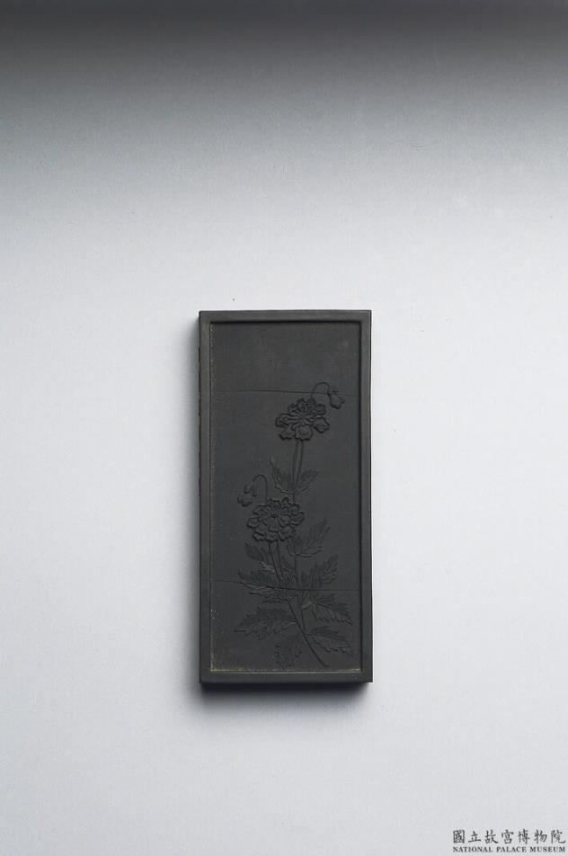 长方形墨,边框起棱。一面有填金隶书乾隆诗作:「御咏罂粟。开到米囊春欲残,不供实用祇供观,笑他罂里虽盛粟,那与贫人作一餐。」一面模印婴粟花一枝,叶片繁茂,其上有两朵盛开婴粟花。墨侧有「大清乾隆年制」楷款。是墨与其他四十七块同储一盒,为成套之乾隆御制花卉诗套墨。