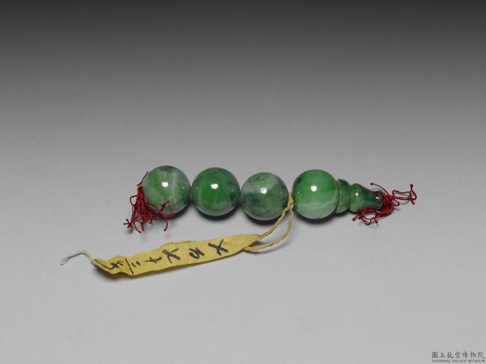 本件由佛头四粒与佛头塔一粒以红绦串成,推测原属「朝珠」之部份构件。朝珠是清朝帝后大臣命妇穿着朝服或吉服时垂挂于胸前的饰物,由一百零八粒珠贯串而成,每二十七粒珠之间以一粒其他质材之珠区隔,称为「佛头」;本件文物中的绿玉圆珠即为佛头。通常垂挂朝珠时,颈后方之佛头下接有一「佛头塔」,下垂一背云。本件中的塔状翠玉即为佛头塔。本件佛头与佛头塔皆色泽翠绿,表面光素无纹。带有黄签一张。