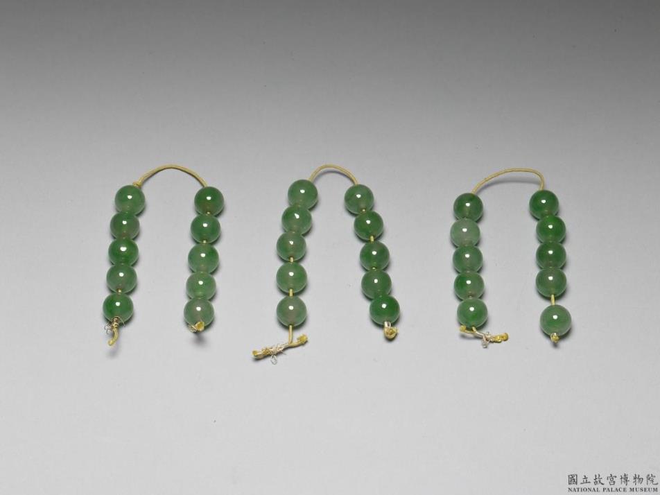 故玉9155~故玉9184共三十粒珠子件合为三串「记捻」,每串各有十粒珠子以黄绳串起,每串珠子又可分成两组,每组五粒珠子。「记捻」又称「记念」或「计捻」,是「朝珠」中的组件。朝珠是清朝君臣命妇穿着朝服或吉服时垂挂于胸前的饰物,由一百零八粒珠贯串而成;朝珠两旁附有三串小珠子,每串十粒,是为「记捻」,配挂朝珠时一边一串,另一边两串,戴法男女有别──男性将两串记捻置于左边,一串在右;女性则为两串记捻在右。本件在内之三串记捻珠子均呈翠绿色,表面光素无纹。