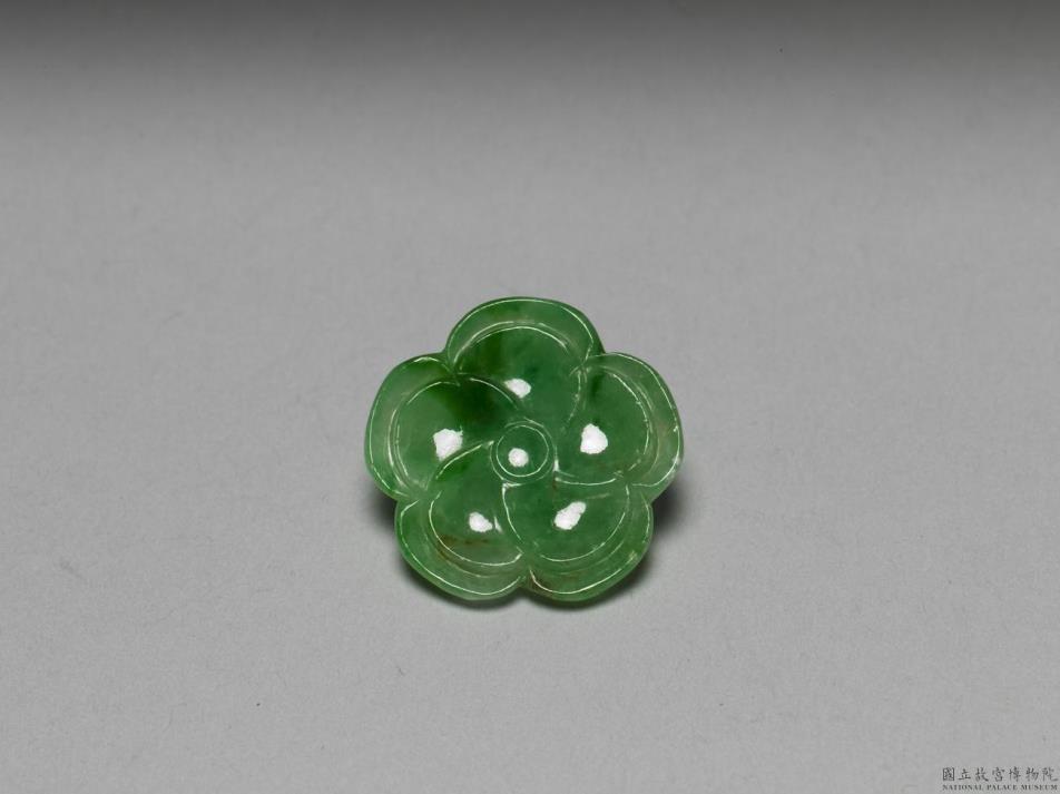 翠玉质钮扣,作五瓣梅花形,背面有一桥形穿以供穿线,称为「站脚」,中有圆孔(又称「孔眼」)以供穿线。此钮扣正面沿着瓣缘内深刻弧线一道,以突出花瓣造型;瓣面再琢五道旋涡形线条,以增加花瓣的三维效果。