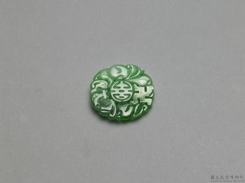 翠玉质钮扣,玉质绿中泛白,正面镂雕纹饰,中央为团寿纹,团寿纹左右镂雕卍字一个与蝙蝠一只,上下均镂雕桃实与枝叶纹,整组纹饰寓意「福寿万年」。钮扣背面光素无纹,有一桥形钮穿(称为「站脚」),中有圆穿(又称「孔眼」)以供穿线。本件整体纹饰以镂空技法表现各组纹饰外轮廓,以阴线刻表现桃实、枝叶、蝙蝠之细节与纹理;团寿纹上下之桃实、枝叶纹饰造型略有差异,并非完全对称。