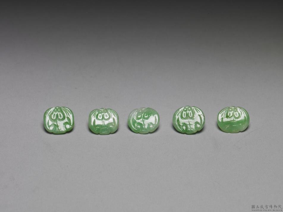 此钮以翠玉制成,玉质绿中泛白,背后有一桥形钮穿。此钮被雕琢成一展翅,作倒吊之姿的蝙蝠造型,并浅刻其翅上细纹。如此纹样以谐音的方式传达了「福气」的吉祥寓意,乃中国传统文化常见的作法。