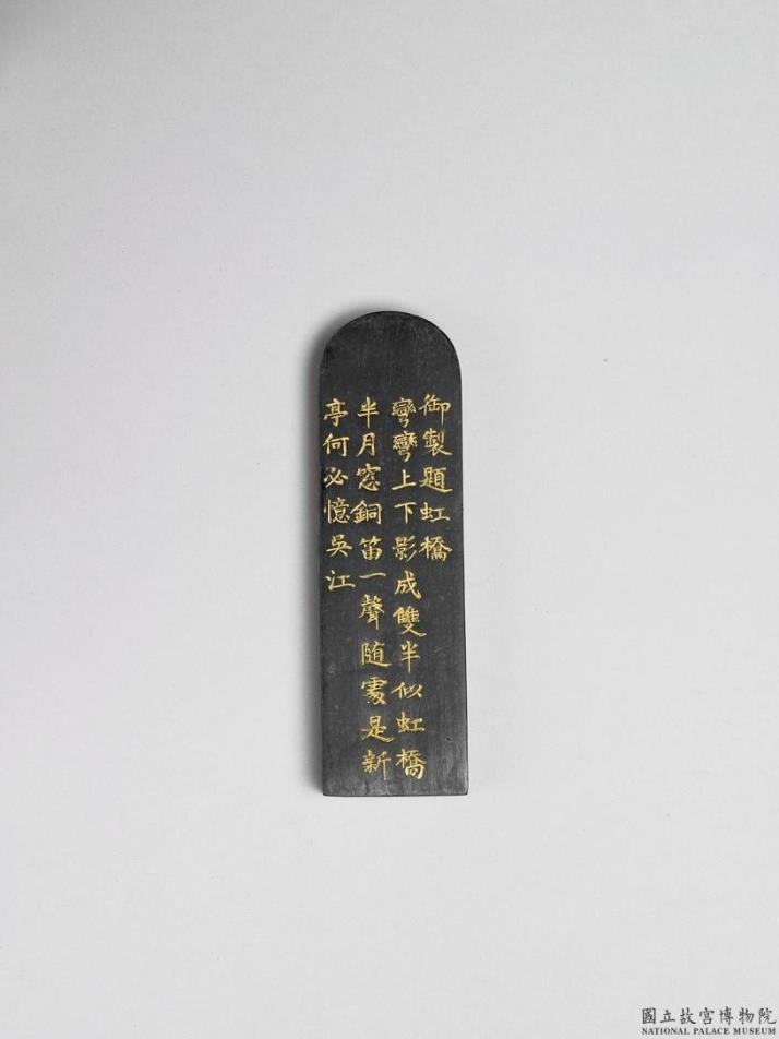 碑碣形墨。一面填金隶书「狮子林墨」,另一面刻填金御制诗「御制题虹桥。弯弯上下影成双,半似虹桥半月窓,铜笛一声随处是,新亭何必忆吴江。」侧有阳文墨款「乾隆辛丑年制」(四十六年,1781)。此乃乾隆题文园狮子林十六景咏景诗,二套共三十二件,储于「螺剂含辉」雕花木盒。