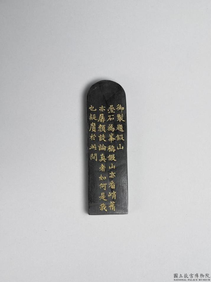 碑碣形墨。一面填金隶书「狮子林墨」,另一面刻填金御制诗「御制题假山。迭石为峯称假山,亦看峭蒨亦孱颜,设论真者如何是,我也疑赝于此间。」侧有阳文墨款「乾隆辛丑年制」(四十六年,1781)。此乃乾隆题文园狮子林十六景咏景诗,二套共三十二件,储于「螺剂含辉」雕花木盒。