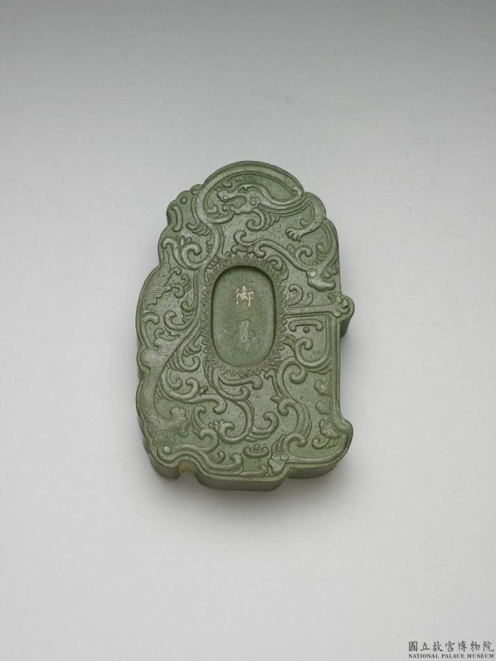 绿色颜料墨,形作仿韘形配。双面墨样对称,模印简化螭纹,中央有椭圆形凹,边饰菊瓣纹一周,一面刻年号款「隆庆」,另一面刻「御墨」并填金。与另三件明墨共收于贴「方于鲁墨」签条锦盒中。