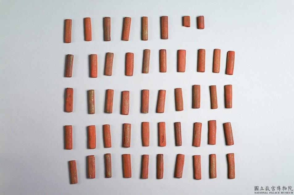 朱砂颜料墨,圆柱形小段,不甚规整,断面有气孔。外表洒金,光素无纹饰。收有一式四十八件。