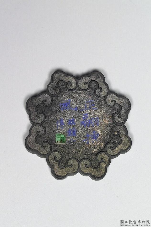 朵花形墨,周缘以八个云头纹围就,面有些微伤裂与霉斑。一面以水波纹为地,蓝书正楷「正翮搏风。临钟太傅」,钤绿色印「天章」,另一面雕猛禽作俯冲状,旁书「仿宋徽宗」。有黄签「古墨二锭。破紫檀盒内盛。缺裂」。吴倬,字天章,生于明末,为清初著名制墨家,以「闇然室」为斋号。吴天章所制墨品以集锦一类知名于世。