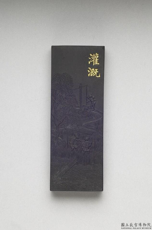 长方形墨,色深黝细腻。一面模印农人河边踏水车引水,取水灌溉,旁金书「灌溉」。另一面漱金题「御诗。水利通沟洫,田功茂育加,桔槔流响逸,䆉稏漾芬赊,隔堰波翻影,盈畴浪叠花,踏歌忘力倦,桞外日西斜。」御制耕图诗墨一套二十四件,共收于双龙「御制耕图诗墨」漆盒,并有锦袱。