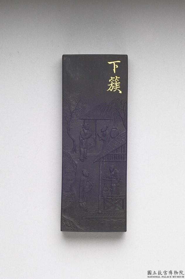 长方形墨。一面模印填金楷字「下簇」,并模印屋舍庭树,就中四人两两相对晤谈,殆正讨论贸易。另一面漱金题:「御诗。邻里欣相贺,家家蚕事成,匀圆雪光皎,错落玊辉莹,下簇分多寡,聚笼衡重轻,用功常不懈,始得万丝盈。」御制织图诗墨一套二十四件,共收于双龙「御制织图诗墨」漆盒,并有锦袱。