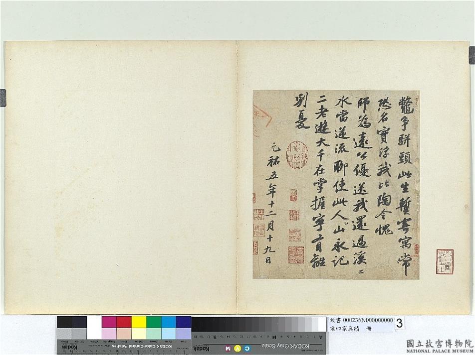以诗文投赠唱和,在古代文人士大夫之间经常可见,透过诗文一来一往,既可切磋学问,又能增进彼此的情谊。宋代文学大家苏轼,也曾与辩才法师诗文唱和,其中的趣味第三者同样可以分享。 辩才法师俗名徐元净,精研佛理,在杭州讲经说法多年,与苏轼相处十分融洽。由于深知苏轼才学过人,怀抱济世的理想,辩才曾经作诗加以期许,鼓励苏轼专心政事,造福国家人民。苏轼感念这分心意,因此次韵成诗,作为响应。诗中以陶渊明与慧远法师的友谊来比况,推崇辩才,慨称自己有愧陶渊明。此时苏轼五十五岁,知杭州。苏轼,字子瞻,号东坡居士,四川眉山人。在文学史上,推为唐宋八大家之一;在书法史上,也同时名列宋四家之一。这件作品,兼有诗文、书法之美,也可以感受到苏轼坦率真诚的个性。(王竞雄)