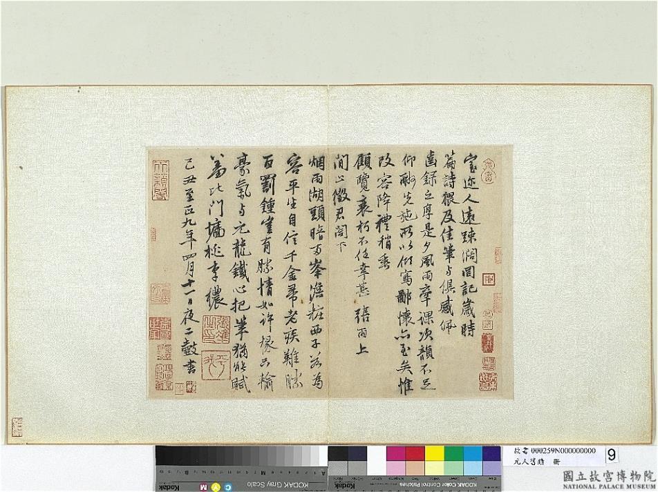 室迩人远。疎阔罔记岁时。篇诗猥及。佳笔与俱。感佩齿录之厚。是夕风雨。牵课次韵。不足仰酬先施。所以倾写鄙怀亦至矣。惟改容降礼。稍垂顾览。衰朽不任幸甚。张雨上。闲止征君阁下。烟雨湖头暗两峰。澹?西子若为容。平生自信千金帚。老疾难胜百罚钟。岂有胜情如许掾。只输豪气与元龙。铁心把笔犹能赋。羞比门墙桃李秾。 已丑至正九年(公元一三四九年)四月十一日夜二鼓书。
