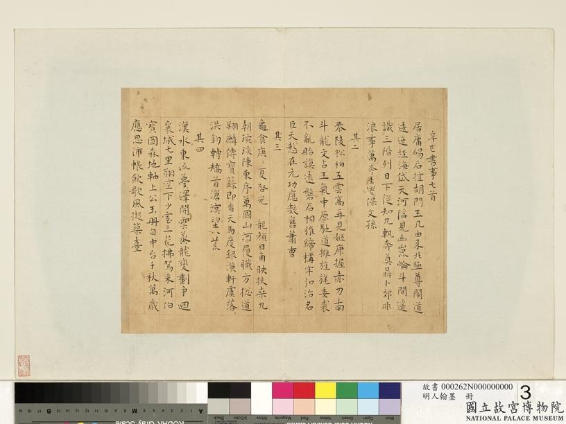 辛巳书事七首。居庸碣石控胡门。玉几由来北极尊。阁道逶迤经海岱。天河隐见出昆崘。斗间遥识三阶列。日下从知九轨奔。奠鼎卜郊非浪事。万年圭鬯保文孙。 其二。泰陵松柏五云高。再见姬康握赤刀。南斗龙文占王气。中原驰道拥旌旄。委裘不乱贻谟远。盘石相维缔构牢。弘治名臣天憗在。元功应数旧萧曹。 其三。龟食庚庚夏启光。龙颜日角映扶桑。九朝琬颜琰陈东序。万国山河履职方。摠道翔麟传宝箓。即看天马度银潢。轩虞落落洪钧转。矫首沧溟望八荒。 其四。汉水东流梦泽开。云蒸龙变划争回。襄城七里翔空下。少室三花拂驾来。河伯宝图森地轴。上公玉册自中台。千秋万岁应思沛。帐饮歌风拟筑台。 其五。明光甲仗下金鸡。中使星轺降紫泥。三殿丝纶垂象丽。九霄日月覆盆低。云扶宝鼎黄风穆。天遶玑衡舜政齐。更喜求贤温语切。龙光长指钓璜溪。 其六。内侍传宣摠插貂。虎贲丝络递乘轺。尔曹肉食终无赖。天下军输半已凋。朔雪炎风归紫极。铜驼金马郁青霄。万年历服超三五。努力夔龙翊帝尧。 其七。晓仗彤云拂羽旗。大行重引汉官仪。紫衣簪笔钩陈肃。白虎谈经刻漏迟。即喜春王传正朔。似闻天乐奏咸池。南星错落江沱远。北斗瞻依藿食私。 嘉靖甲申(公元一五二四年)五月廿三日。雨中坐辛夷馆。风竹萧疎。斋无杂客。与刘复孺晤语。因录旧作请政。王宠履吉书。