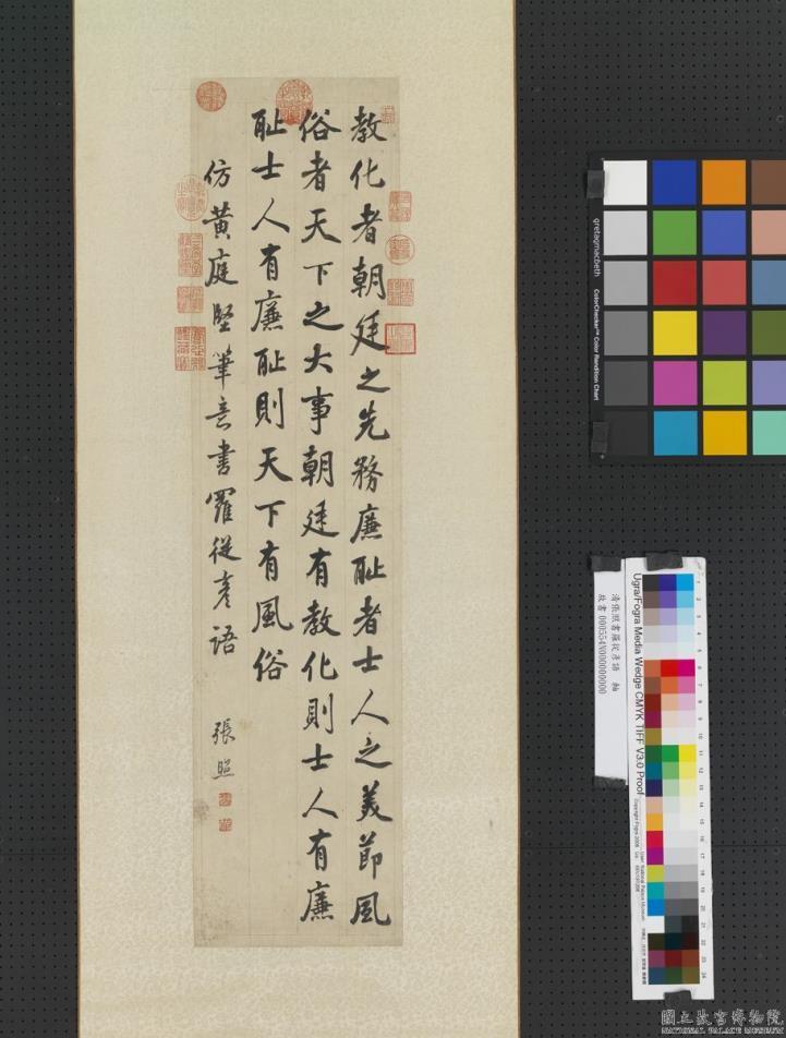 教化者。朝廷之先务。廉耻者。士人之美节。风俗者。天下之大事。朝廷有教化。则士人有廉耻。士人有廉耻。则天下有风俗。仿黄庭坚笔意。书罗从彦语。张照。