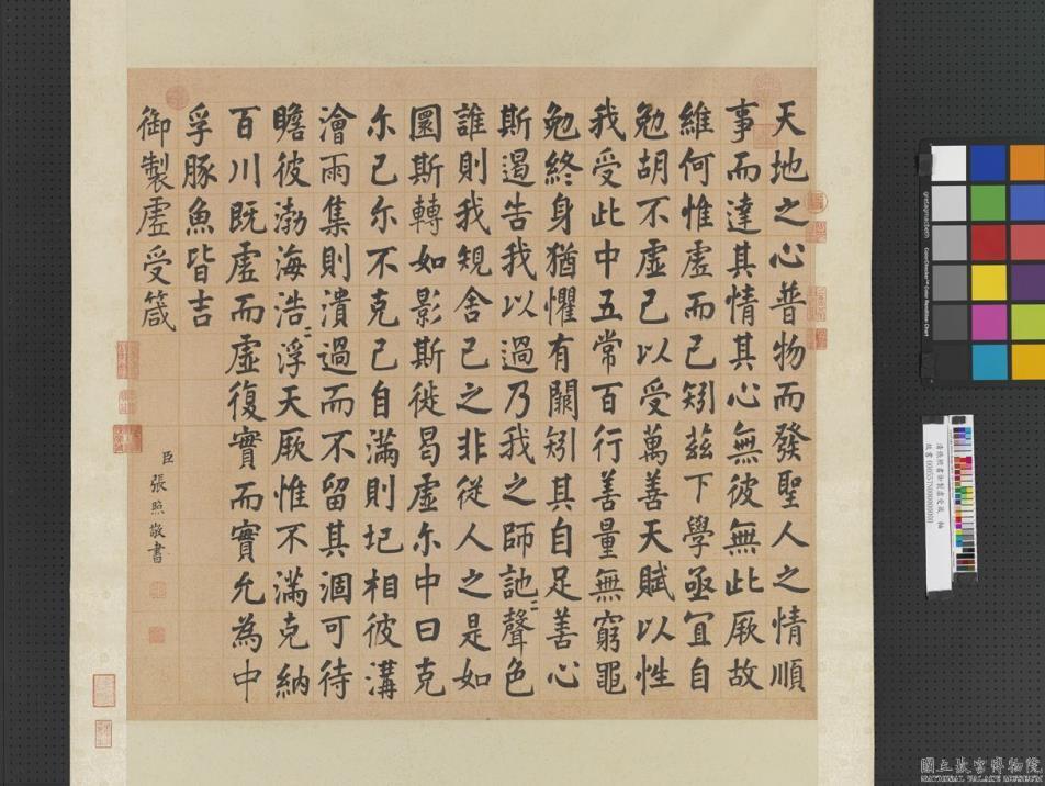 天地之心。普物而发。圣人之情。顺事而达。其情其心。无彼无此。厥故维何。惟虚而已。矧兹下学。亟宜自勉。胡不虚己。以受万善。天赋以性。我受此中。五常百行。善量无穷。黾勉终身。犹惧有阙。矧其自足。善心斯遏。告我以过。乃我之师。訑訑声色。谁则我规。舍己之非。从人之是。如圜斯转。如影斯徙。曷虚尔中。曰克尔已。尔不克己。自满则圮。相彼沟浍。雨集则溃。过而不留。其涸可待。瞻彼渤海。浩浩浮天。厥惟不满。克纳百川。既虚而虚。复实而实。允为中孚。豚鱼皆吉。御制虚受箴。臣张照敬书。