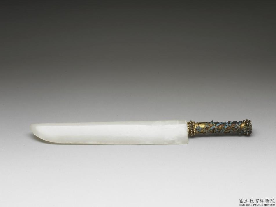 白玉。玉作一细长刀形,刃部尖端圆弧收尖,应无使用痕迹。镶金铜柄,两端分饰小珠三圈,中段以翠鸟羽毛贴式花叶纹。
