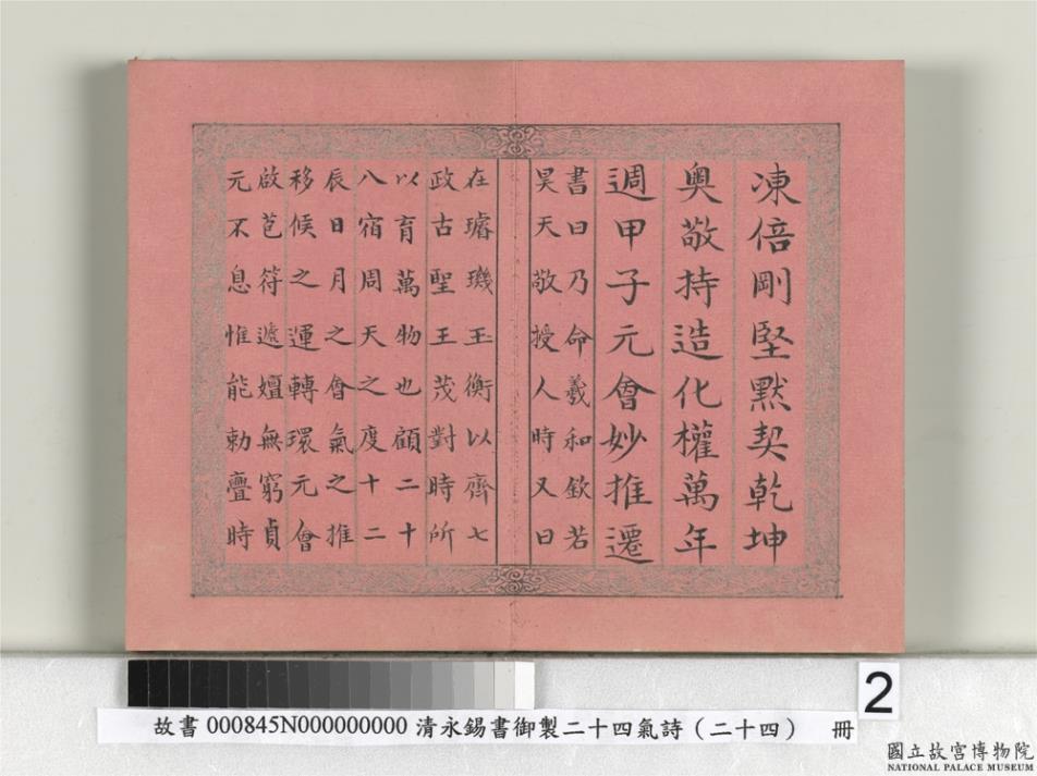 来复机初畅。大寒气始宣。(小字注。小寒加十五日。斗指丑则大寒。三礼。义宗曰。上形于小寒。故谓之大。自十一月一阳爻初起。至此始彻。阴气出地方尽。寒气并在上。故为大寒。)严凝飙若箭。栗烈火无烟。埘静鸡方乳。林疎鸟疾穿。层冰彻上下。冱冻倍刚坚。默契乾坤奥。敬持造化权。万年周甲子。元会妙推迁。(小字注。书曰。乃命羲和。钦若昊天。敬授人时。又曰。在璇玑玉衡。以齐七政。古圣王茂对时。所以育万物也。顾二十八宿周天之度。十二辰日月之会。气之推移。候之运转。环元会启。苞符递嬗。无穷贞元。不息惟能。勅舋时几。行健以法天。无疆以法地。易所谓。日月得天而能久照。四时变化而能久成。圣人久于其道而天下化。成者信乎其与天地合德矣。予抚辰凝绩。不敢康宁所冀征协箕畴。气和玉烛。天工民事。无旷无愆。以臻亿载。承平之治。故予屡用时序。纪之篇什。则此咏亦不外乎制治保邦。祈天永命之要道也。)臣永锡敬书。