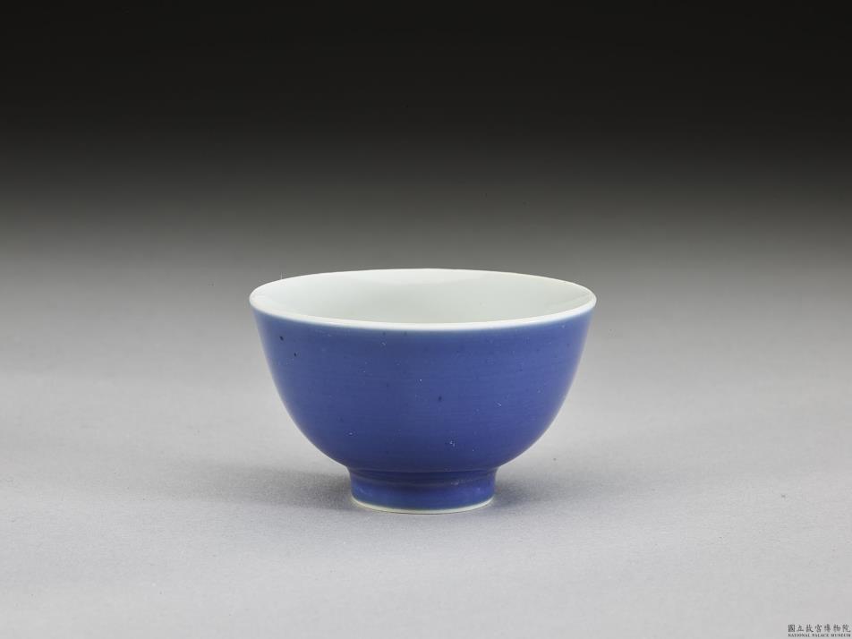 敞口,弧壁,矮圈足。器内壁为白地,光素无纹,外壁施霁青釉,口沿与足边各留一道白边。器底为白地,以青花书「大清乾隆年制」六字三行篆款。