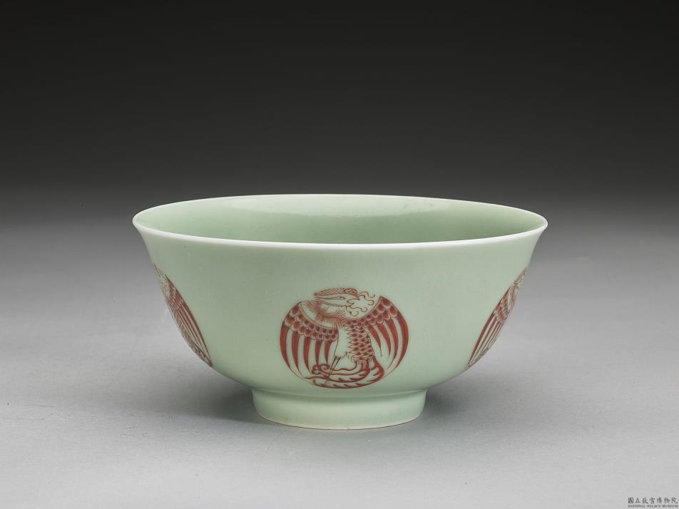 圆口,唇缘微外侈,弧形深壁,平底,矮圈足。器壁通施冬青釉,釉色呈粉绿。外壁装饰五个描红团凤纹,碗心亦绘一团凤纹,凤首、躯体与凤尾成S型,双翅展开于两侧,使图案成圆形,线条粗细分明。底有青花书「大清雍正年制」二行六字楷款,外加双圈。