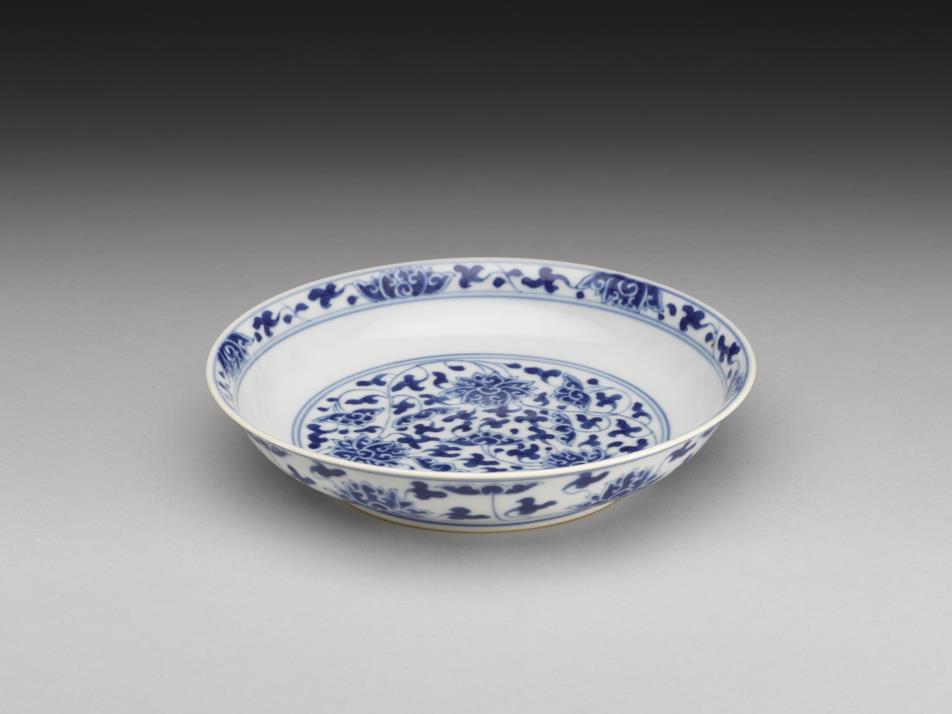 侈口窄唇,浅壁,矮圈足。胎质较薄,外壁画盛开及待开之缠枝番莲共十二朵,盘心双圈青线内则绘绽放之番莲三朵与未绽番莲七朵,内壁口沿饰番莲纹一周。底有「大清乾隆年制」三行六字篆款。