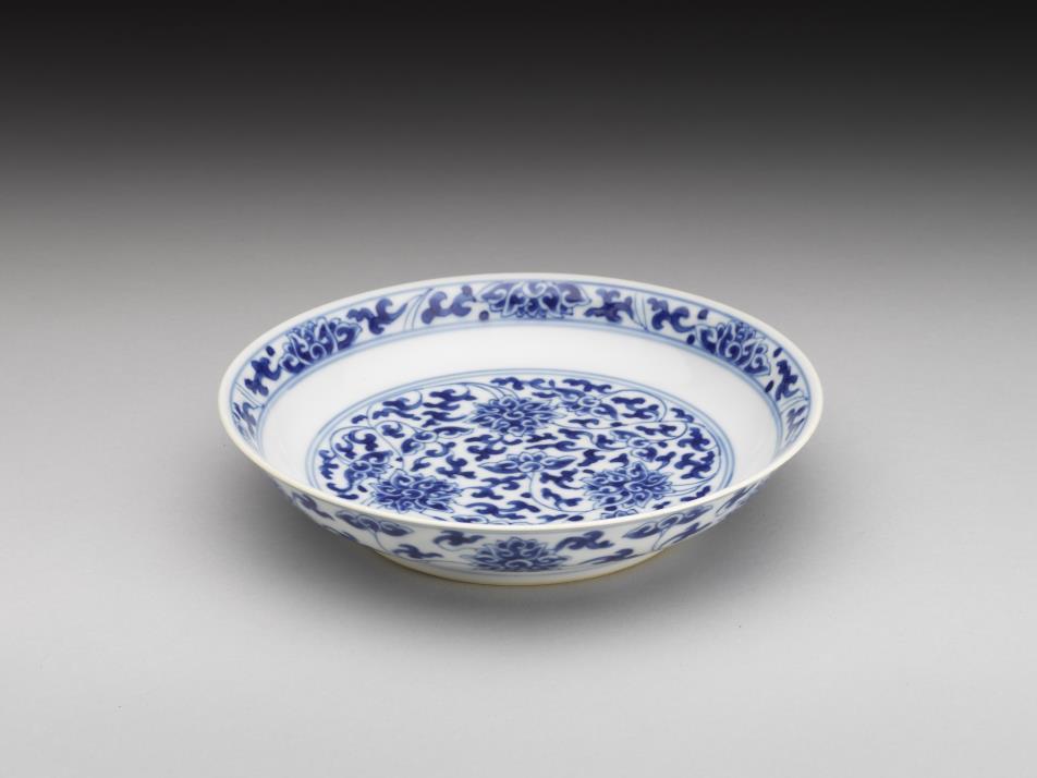 侈口窄唇,浅壁,矮圈足。胎质较薄,外壁画盛开及待开之缠枝番莲共十二朵,盘心双圈青线内则绘绽放之番莲三朵与未绽番莲七朵,内壁口沿饰番莲纹一周。底有「大清乾隆年制」三行六字篆款。