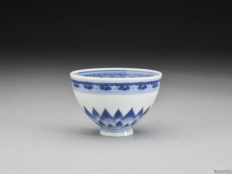 口部微外侈,弧形壁、上丰下敛,圈足。内、外壁口沿下分饰回纹、花瓣纹一周,外壁底边饰莲瓣纹二层一周,中段留白,碗心饰几何花卉纹。底有青花书「乾隆年制」四字二行篆款。