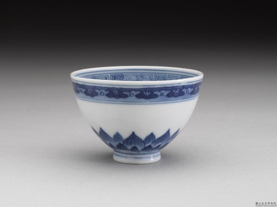 口部微外侈,弧形壁、上丰下敛,圈足。内、外壁口沿下分饰回纹、花瓣纹一周,外壁底边饰莲瓣纹二层一周,中段留白,碗心饰几何花卉纹。底有青花书「乾隆年制」四字二行篆款。