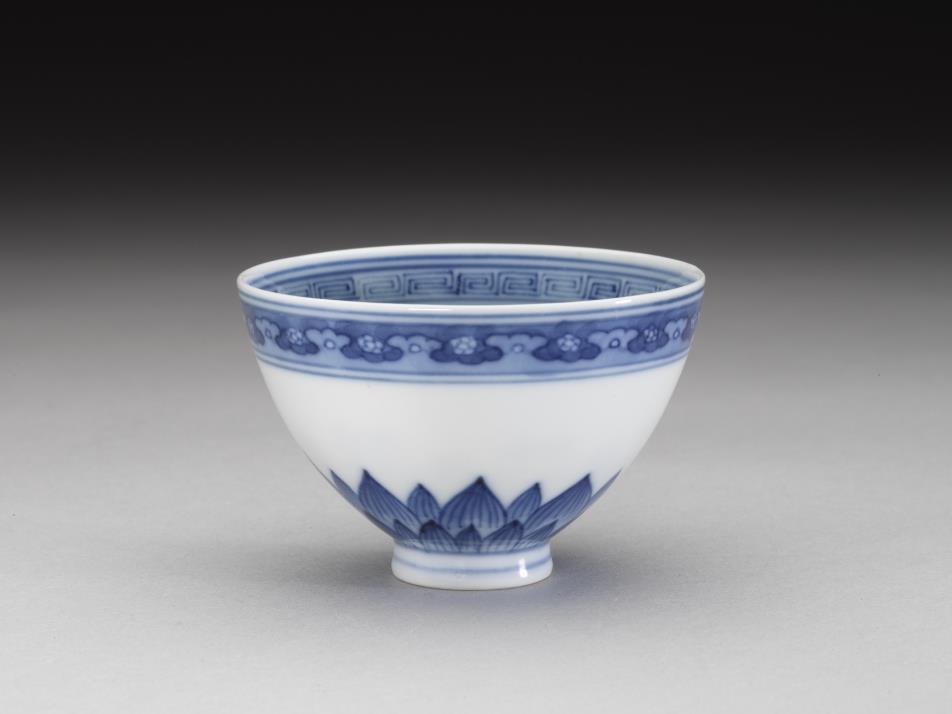 口部微外侈,弧形壁、上丰下敛,圈足。内、外壁口沿下分饰回纹、花瓣纹一周,外壁底边饰莲瓣纹二层一周,中段留白,碗心饰几何花卉纹。底有青花书「乾隆年制」四字二行篆款。