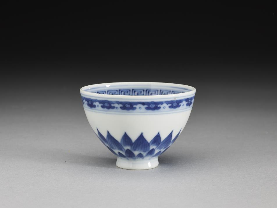 口部微外侈,弧形壁、上丰下敛,圈足。内、外壁口沿下分饰回纹、花瓣纹一周,外壁底边饰莲瓣纹二层一周,中段留白,碗心饰几何花卉纹。底有青花书「乾隆年制」四字二行篆款。