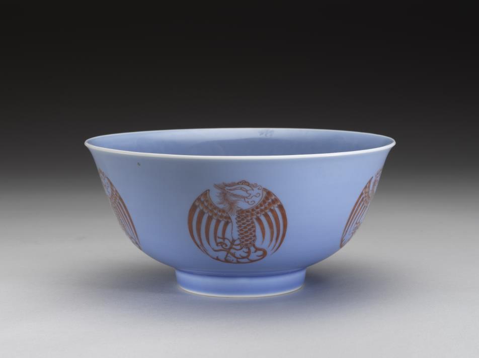 蓝釉描红团凤纹碗